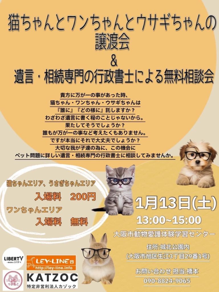 猫ちゃんとワンちゃんとウサギちゃんの譲渡会&遺言・相続専門の行政書士による無料相談会